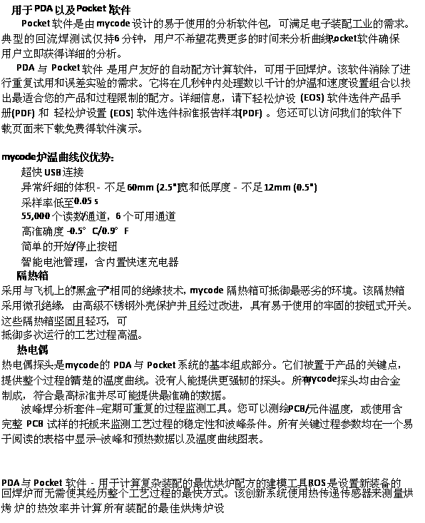 mycode溫度系統(tǒng)穿越整個(gè)過程,您可以監(jiān)測(cè)波峰焊接和回焊工藝過程,以及氣相、選擇性焊接和拆焊臺(tái)。該系統(tǒng)由經(jīng)特別設(shè)計(jì)的熱電偶、數(shù)據(jù)記錄器、保護(hù)性隔熱箱和windows軟件構(gòu)成,可幫助您優(yōu)化產(chǎn)品質(zhì)量、加速過程設(shè)置、提高產(chǎn)量,最大程度地減少返工。
